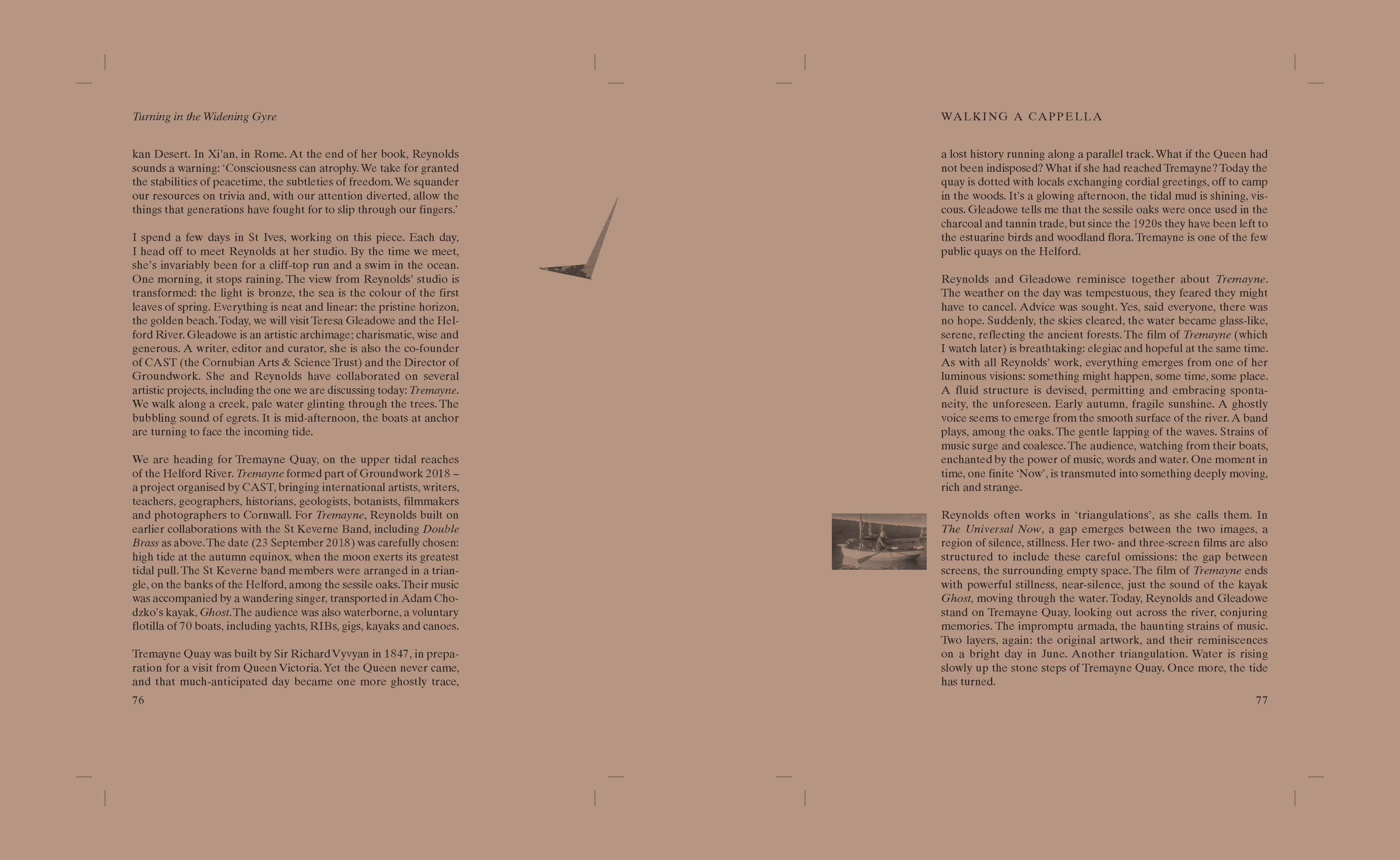 Abigail Reynolds writes the introduction to this book of her creative endeavours from her studio at Porthmeor in St Ives, where a strong Atlantic wind drives sand against salt-crusted windows and the sound of the surf fills the room. This elemental, shifting environment frames the making of Walking A Cappella, a book that reflects the looping and discursive nature of her artistic practice.